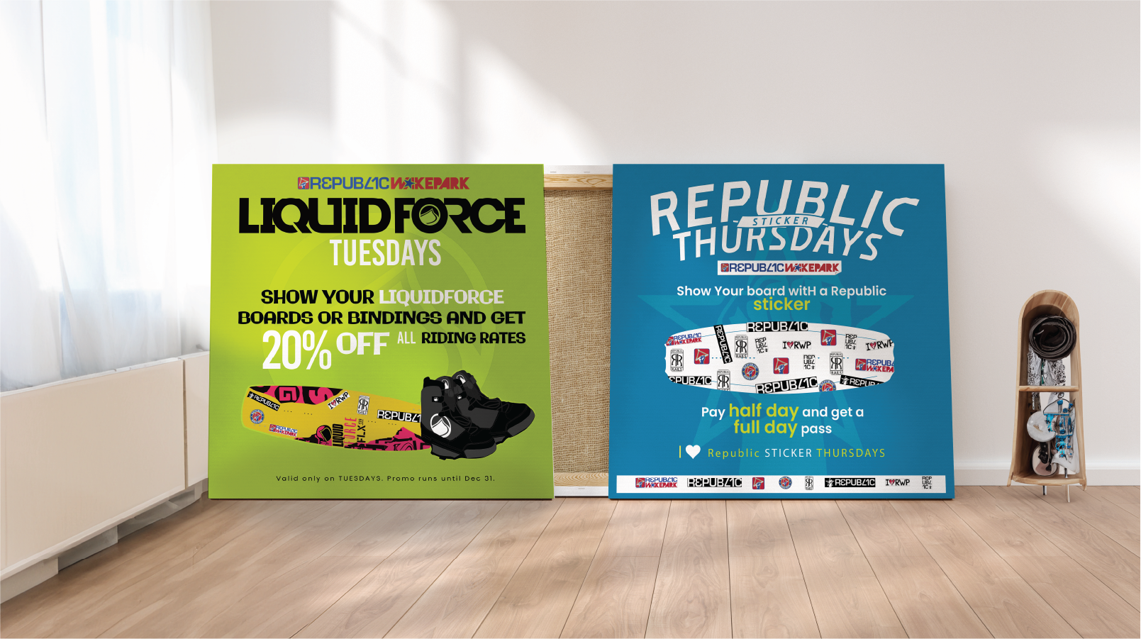 Republic Wakepark approached us to revamp their brand presence, both online and offline. Our team was responsible for creating a cohesive brand identity through various print and digital materials, including print layouts, a product catalog, letterheads, flyers, and promo banners.
